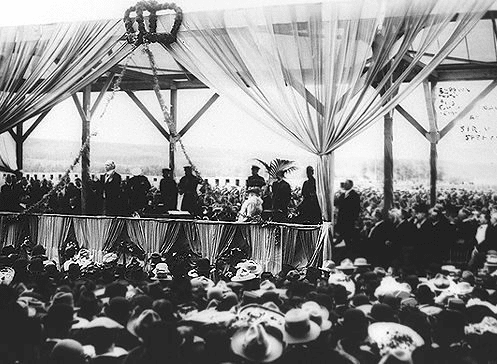 The first provincial election in Alberta was held on November 9, 1905, in which the Liberal Party finished with 23 seats out of 25. On March 15, 1906, George Bulyea addressed a crowd of four thousand in Edmonton, officially opening the first session of the Alberta Legislative Assembly, where participants tackled a host of issues— from setting speed limits for motor vehicles to establishing the University of Alberta. It was also then that Edmonton was officially chosen as the provincial capital, and the site for the new Legislative Building was selected on the banks of the North Saskatchewan River, overlooking Fort Edmonton.